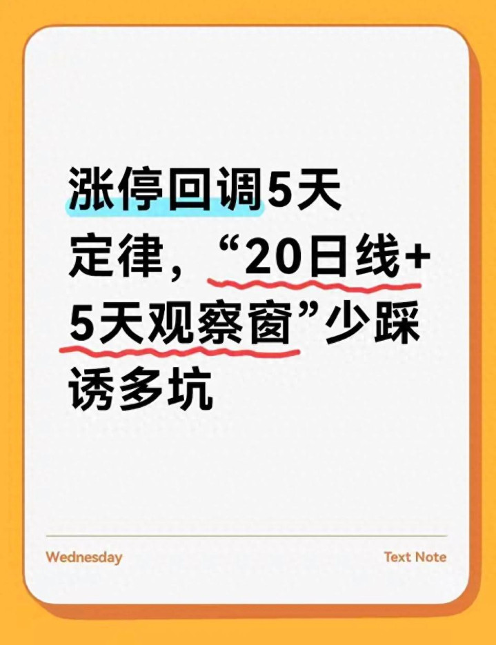 有粉丝问我,涨停回调后该怎么甄别第二波机会,总怕踩到诱多的坑。我觉得涨停回调后的操作核心,是找对趋势支撑和甄别周期,选错参考依据就容易陷入主力诱多的圈套,参考维度直接决定了你是盲目跟风,还是理性甄别,又或是稳健把握波段机会。从风险规避考虑,如果20日线和5天观察窗都符合甄别条件,那把握行情的靠谱度自然更高,也能大幅避开诱多带来的亏损。市场有句心得,涨停看强度,回调看支撑,观察辨真假。平时大家可能看单日走势比较多,但单日走势看似强势的时候,往往诱多行情已经快走完了,可能转瞬就会朝反方向运行。那我们如何通过20日线和5天观察窗来甄别涨停股第二波的启动信号呢?如果你还不会这个甄别思路,那你就得认真看了